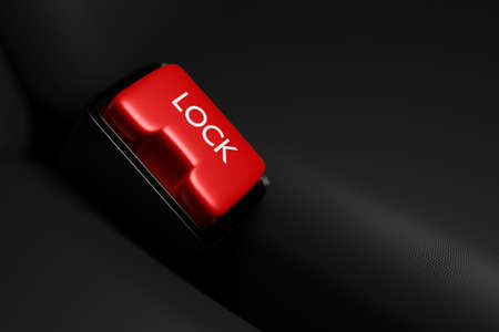 3d illustration of a seat belt buckle in a car. Close-up of red button to lock seat belt