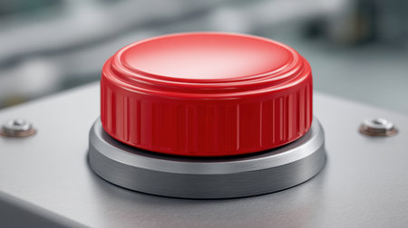Close-up of bright red emergency stop button on metallic surface. for industrial safety, emergency protocols, machinery control, and workplace safety concepts.