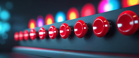 AI Generated. Red Arcade Buttons on Black Panel with Neon Lights Gaming Retro Fun