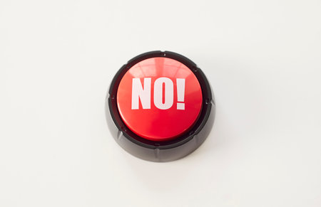 Red push button with bold white letters spelling NO! placed on a clean white surface. A symbolic object for rejection, denial, refusal, or humorous feedback in various contexts.