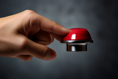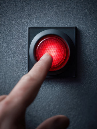 A hand firmly presses an glowing red emergency switch against a rugged, shadowy background, conveying urgency and readiness for decisive action.