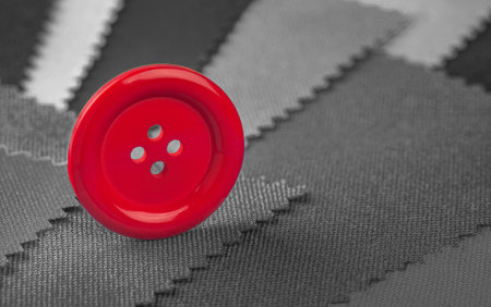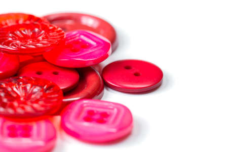 Colorful red and pink buttons on a white background. Lots of red buttons. Old vintage buttons close up. Copy space. Top view. Background of buttons.