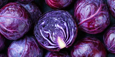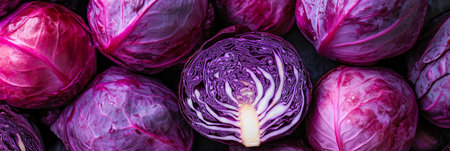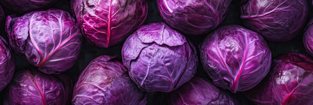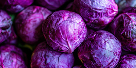 Striking arrangement of fresh purple cabbages with bold textures and rich colors, highlighting natural beauty and freshness