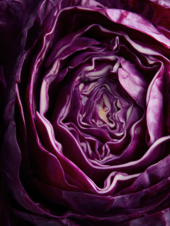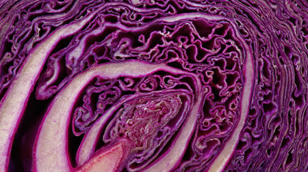 Delve into the fascinating layers of red cabbage as the macro view reveals a mesmerizing labyrinth of color and texture, showcasing nature's artwork in extreme detail.