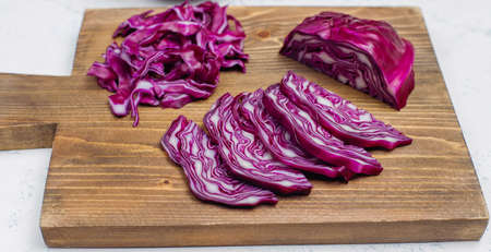 Chopped red cabbage close-up on a cutting wooden board in the kitchen.