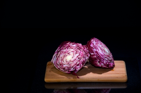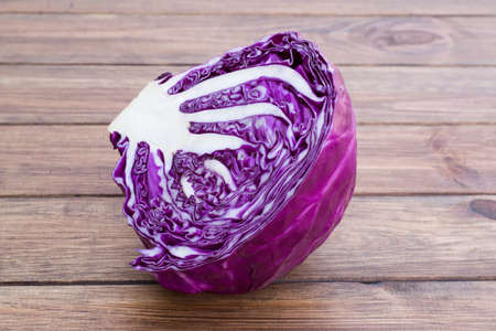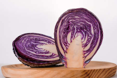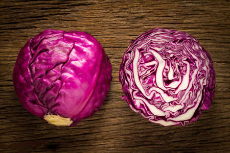 cabbage purple on wooden. kitchen. morning. slice. half.