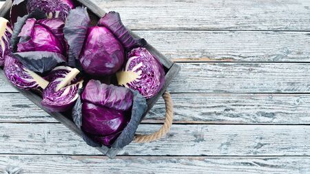 Purple cabbage in a wooden box. Organic food. Top view. Free space for your text.