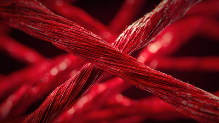 A striking close-up of a smooth and shiny red twisted rope creates a captivating visual against a deep red background, perfect for creative projects.