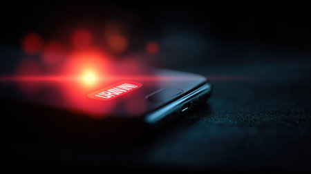 A smartphone vibrates on a surface at night, displaying an urgent notification with a glowing red light against a dark background.