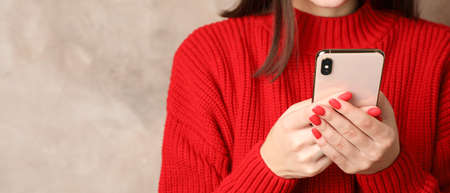 Beautiful woman using phone on brown background. Space for text