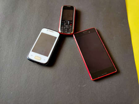 Keypad mobile and two smart phones placed like triangle.Isolated on black background. Selective focus