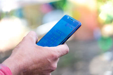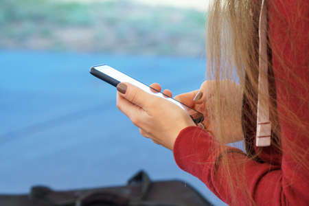 Girl types the screen on the mobile phone sms message or chats