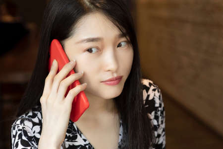 Chinese American woman deep in thought using an red smart phone in a coffee shop