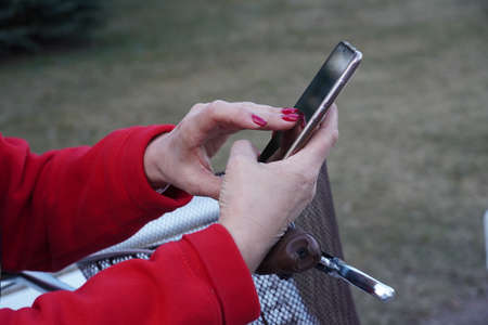 A smartphone in the hands of a woman in a red jacket sitting on a bench in a city park. Young woman, girl writes a message on a smartphone.