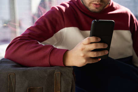 boy's hand resting on his backpack consults the mobile phone. no face