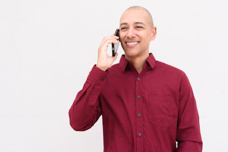 African American man with dark skin wearing glasses and red t shirt smiling while holding smartphone in hand isolated on white background. Casual style and technology use.