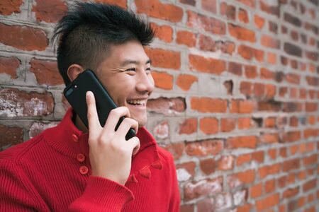 Portrait of young Asian man talking on the phone outdoors against brick wall. Communication concept.