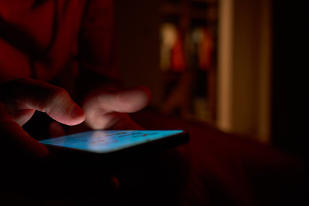 Close-up of male hands holding smartphone with glowing screen in dark room. Man using smartphone at night. Concept of technology and online communication