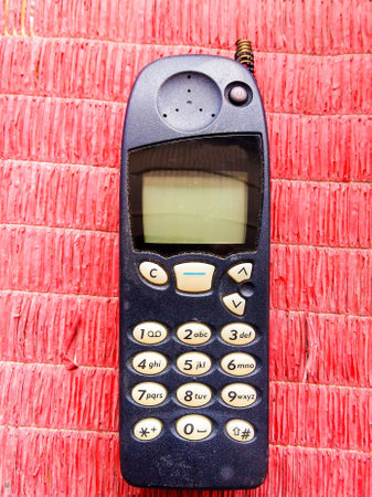 The old black cell phone on the red background.