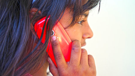 Attractive girl with a red cellphone. Girl talking on phone. Girl closeup shot during communication.