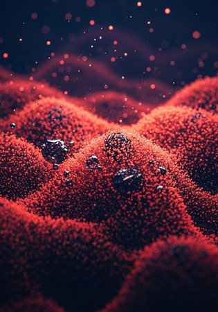 A vibrant red landscape with small particles and water droplets in a dramatic scene