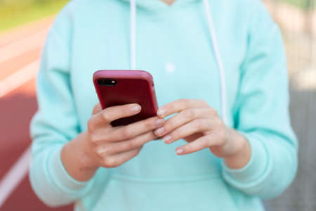 a young woman in sportswear and a warm blue hoodie uses a smartphone. online training sports apps