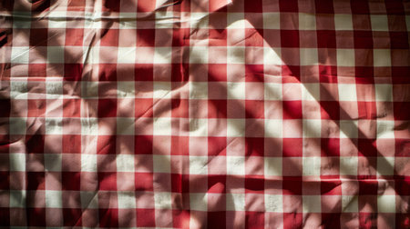 Red and white checkered fabric with folds and sunlight, textured pattern. Home decor and textile design concept