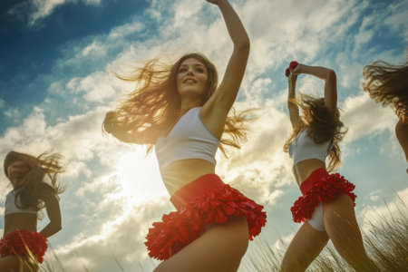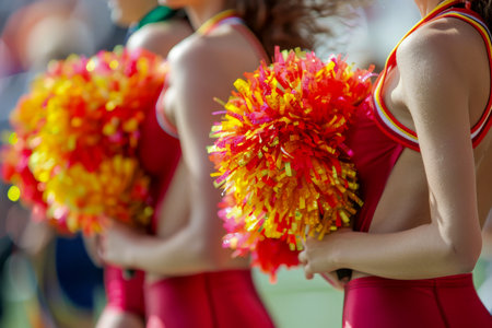 Girls with pompom from cheerleader team dancing outdoors during competition