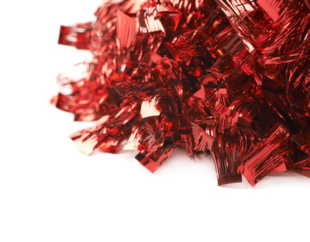 Close-up fragment of the tinsel red garland decorations isolated over the white background as a copyspace backdrop composition