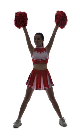 A high school cheerleader is standing tall with her red and white pompoms behind her.
