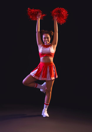 Full-length portrait of young girl, cheerleader in sportswear posing in motion against pink studio background