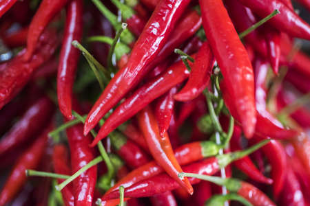 Top view some of the red chili or Jinda Chili in Thai language, close up image, arranged fresh chili as a pattern on white background.