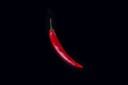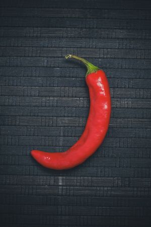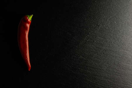 Red chili pepper on black background. One hot chili pepper and copy space. Fresh spicy ingredient for cooking.