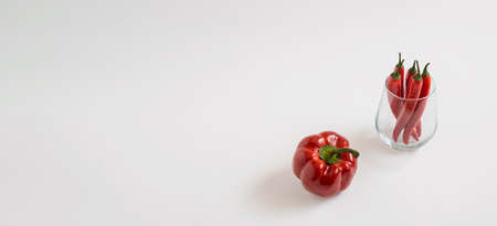 Paprika, red chili peppers in a transparent glass on a white background, banner compopsition with a copy space