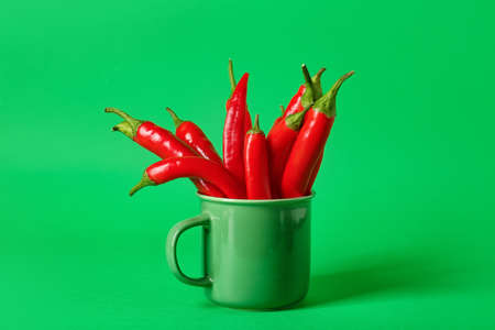 Fresh hot chili pepper on red bright surface. Closeup High quality photo