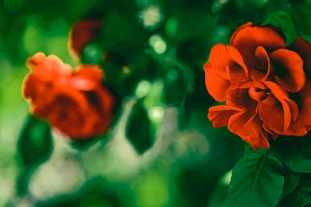 Red roses in beautiful flower garden as floral background