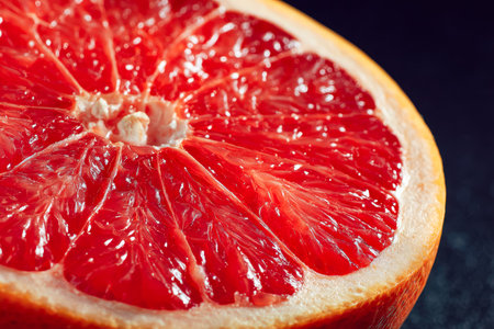A vivid, close-up shot highlighting the textured surface and vibrant hue of a freshly sliced citrus fruit, set against a sleek black backdrop for striking contrast.