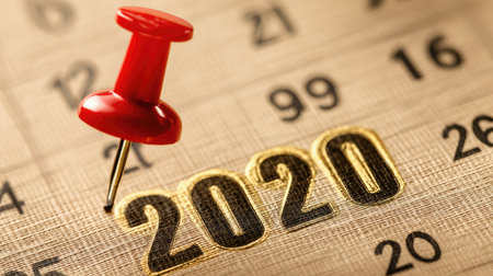 A close-up image of a red push pin highlighting the year 2020 on a calendar page, symbolizing important dates and event planning. Perfect for organizational themes.