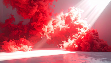 Vibrant red smoke billows and swirls in a bright room illuminated by dramatic sunbeams from above.