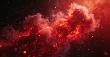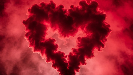 Red smoke swirling to form a heart shape against a dark red smoky background. Clear details and vibrant colors...