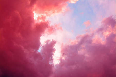 Grunge image of sky with red clouds on grainy and dusty film texture. Analog photo. Retro style sky with clouds.