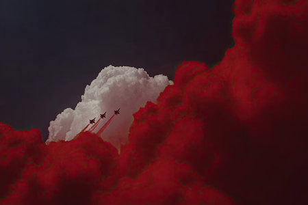 Three jets leaving red smoke trails in a dramatic sky filled with clouds. The image features a dramatic contrast between dark and red.