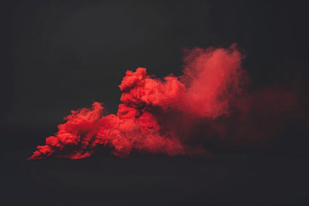 A dramatic burst of red smoke expands against a solid black background, creating a striking contrast. The swirling, cloud like formation captures the dynamic motion and intensity of the explosion.