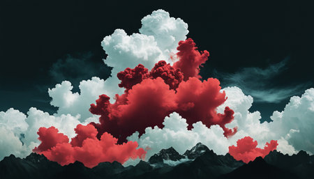 An artistic depiction of layered clouds dominates the scene. The clouds exhibit a combination of red and blue tones, possibly at sunset or sunrise. The image has a textured quality and creates a dramatic atmospheric effect. It can be used in various commercial projects, including editorial or abstract concepts.