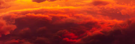 Panorama photo of dramatic sky with orange sunset and clouds