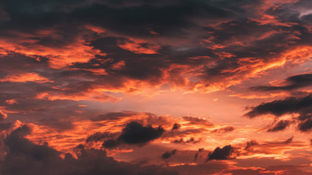Captivating image of a dramatic sky showcasing dark clouds intertwined with fiery sunset colors, creating a breathtaking visual experience at dusk.