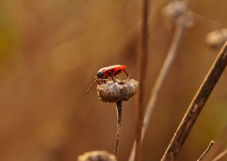 red cardinal beetle sitting and climbing up to a gras straw in the summer. use this image as postcard oder cellphone background