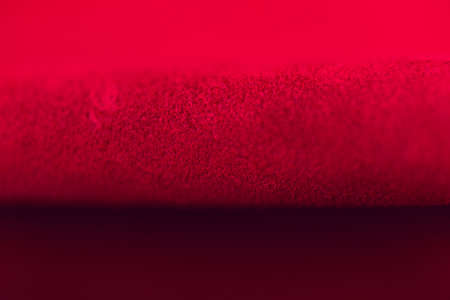 Red matte background of suede fabric, closeup. Velvet texture of seamless leather. Felt material macro. Red suede texture. Fabric, leather, material for designers.