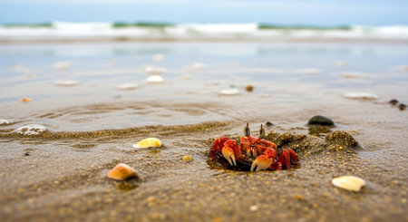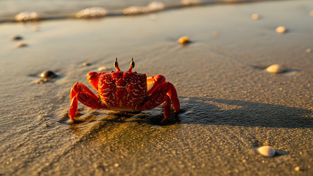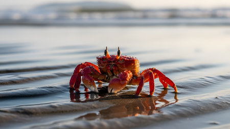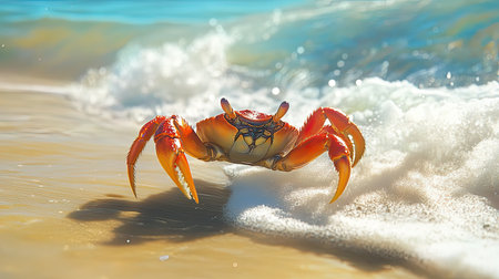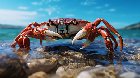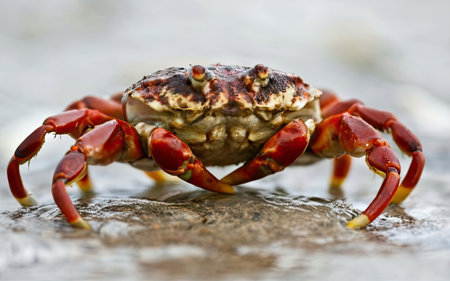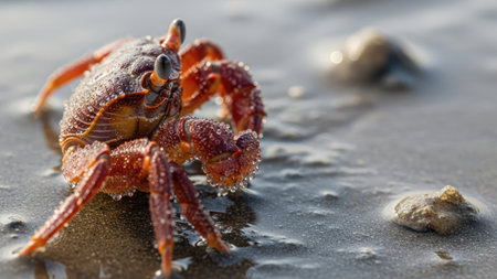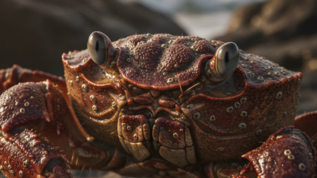 A highly detailed macro image of a reddish-brown crab showcasing textured claws, rugged shell patterns, and coastal lighting captured in refined 4k ai quality.