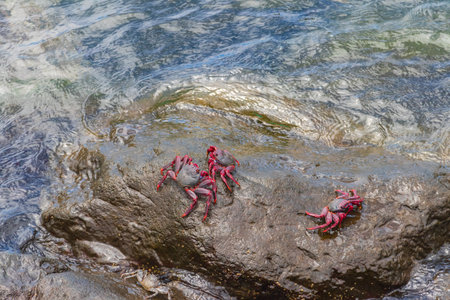 Small crabs crawling on the rocks on the shore. Coral reef wildlife